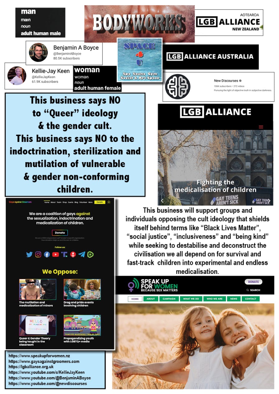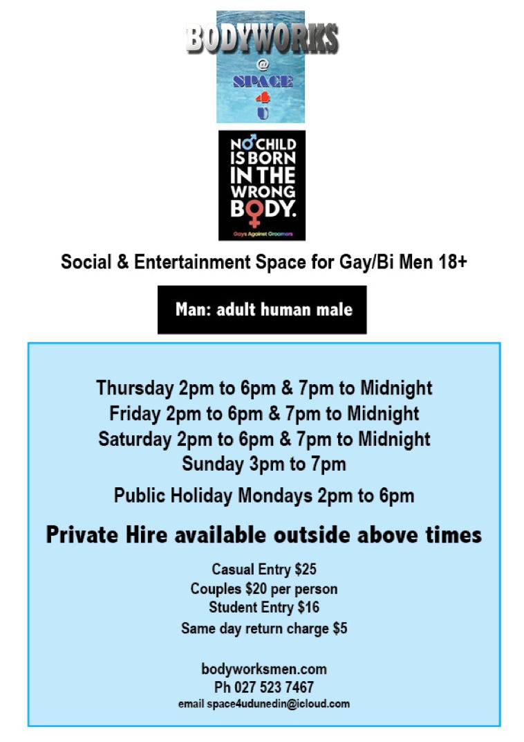 LGB & women’s rights and well being are endangered by the expansion of socially damaging Gender Identity and Queer Theory ideologies from Academia into other institutions, corporations and government. LGB Alliance is attempting to stand against the cult of gender ideology. Space4u and Bodyworks club supports that effort. Check out the LGB Alliance New Zealand website at https://www.lgballiance.nz