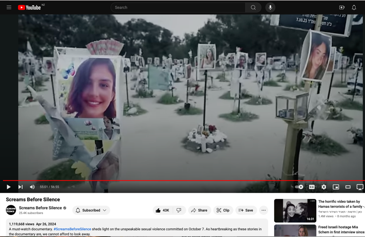 52min Shari Mendes, IDF reservist at October 7th military morgue: “We may never know the extent of the sexual violence because these women were silenced. So every one of us, every one of us, women and men, must speak up for these women and say, ‘We will bear your story, we will bear witness for you, you will not be forgotten, and what happened to you will be told’”
