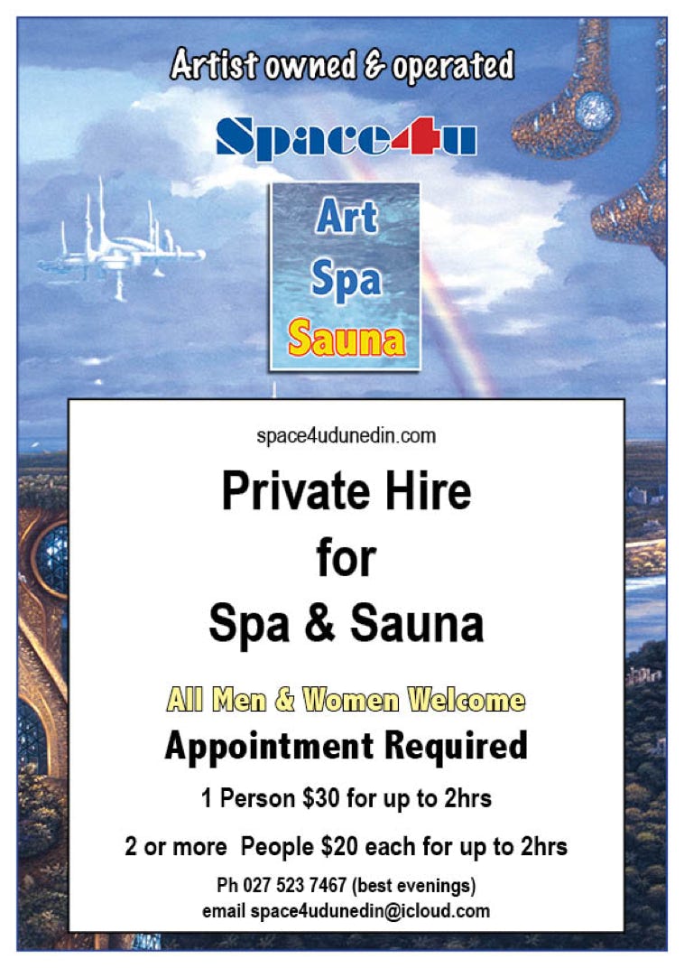 Space4u is one artist’s self-employment effort. Since acquiring the lease in 2012 my goal has been to combine a personal art studio and exhibition space with a fitness and relaxation oriented entertainment facility for individuals and small groups. I have a great enthusiasm for science fiction and social commentary as evident in the art work with the aim to stimulate thoughtful evaluation of issues and promote what I believe to be worthy social values.