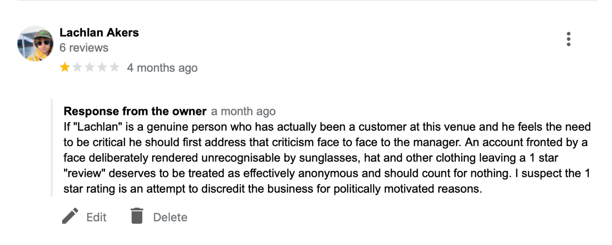 Right: Feb 2024. Recent Google “reviews” and my response. I have judged the “reviews” to be fake and attempts by “trans allies”/activists to downscore the business by exploiting the Google review system which does night require any evidence for the “reviewer” ever having set foot in the business space.