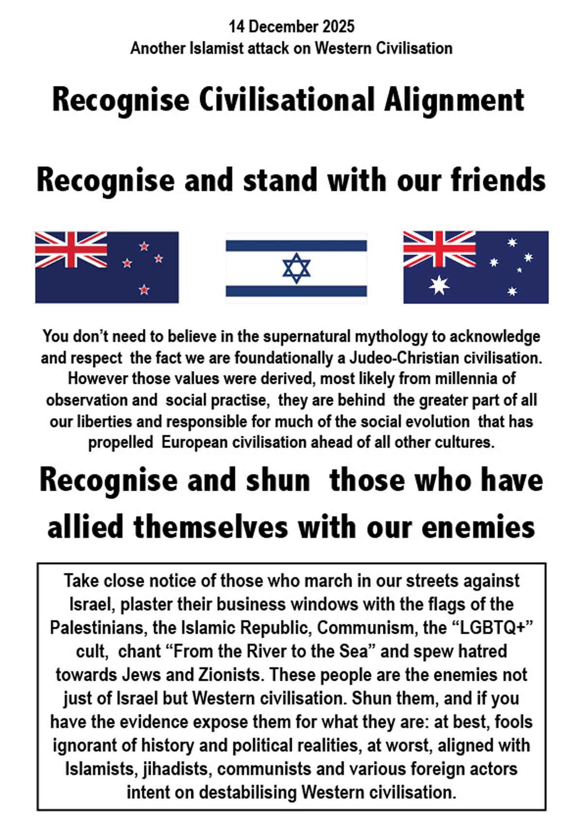 Above: This business stands opposed to the anti-West Islamism that has barbarically attacked Israel and has been foolishly imported into NZ and other Western nations by unthinking politicians threatening all our freedoms, especially the rights of women, same sex oriented people and very likely everyone who doesn’t wish to submit to extremist Islamist values .