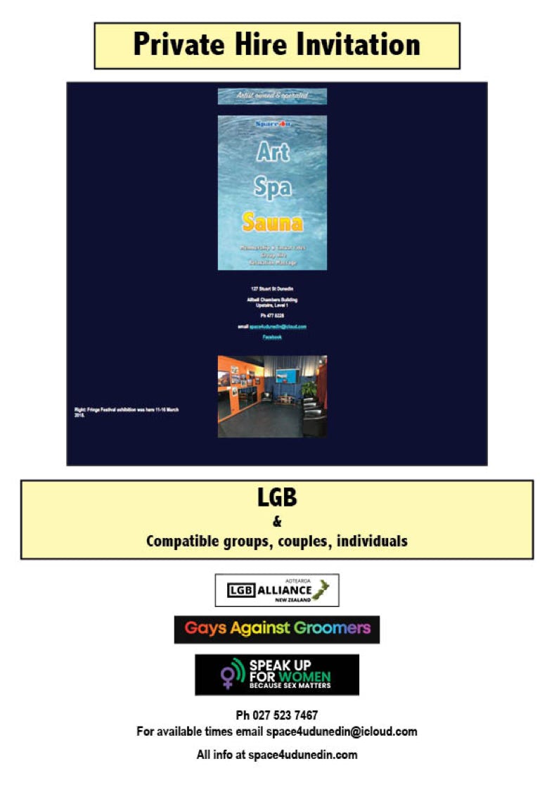 LGB & women’s rights and well being are endangered by the expansion of socially damaging Gender Identity and Queer Theory ideologies from Academia into other institutions, corporations and government. LGB Alliance is attempting to stand against the cult of gender ideology. Space4u and Bodyworks club supports that effort. Check out the LGB Alliance New Zealand website at https://www.lgballiance.nz