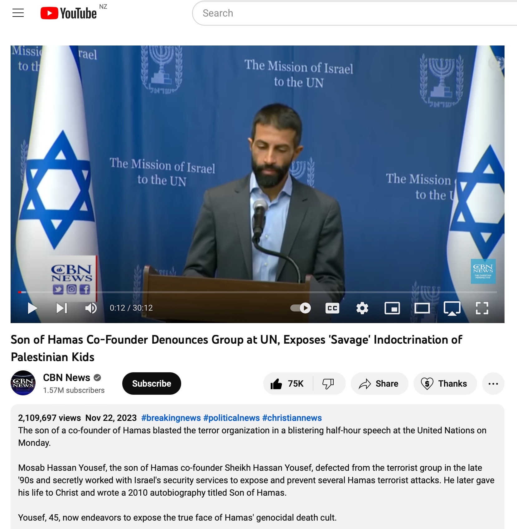 Above: Phenomenal speech on YouTube 22 Nov 2023. Scroll through to read highlights. “Son of Hamas Co-Founder Denounces Group at UN, Exposes 'Savage' Indoctrination of Palestinian Kids”