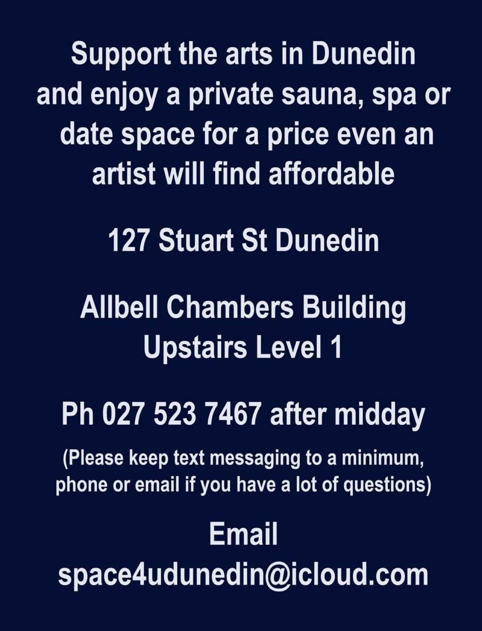 Space4u is one artist’s self-employment effort. Since acquiring the lease in 2012 my goal has been to combine a personal art studio and exhibition space with a fitness and relaxation oriented entertainment facility for individuals and small groups. I have a great enthusiasm for science fiction and social commentary as evident in the art work with the aim to stimulate thoughtful evaluation of issues and promote what I believe to be worthy social values.